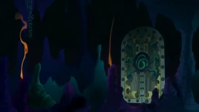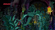 Dreadnaught Cove reappears in the episode special"The Legion of Pirate Villains". Captain Hook attempts to reclaim the lost treasure of the Captain Colossus at the bottom of Dreadnaught Cove. Mr. Smee tries reasoning with Hook that the cove is too dangerous and that the treasure was not worth the risk of waking the Strake. However, Hook bellows that he was not afraid as he enters the Never Sea. Within his diver suit, he accidentally knocks the fragment of the DarkLight Emerald from Lord Fathom by landing on him. Unaware of his actions, Captain Hook's attempts to recover the treasure is quickly thwarted by the Grim Buccaneer, capturing Hook, whom he mistakes for Lord Fathom.