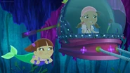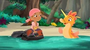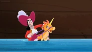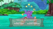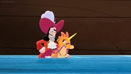 Izzy was singing on the beach near the water edge when she meets a young sea unicorn that quickly bond with her offering a golden shell so she could summon her when ever she may need her.Izzy gives the sea unicorn she named Cornica the sea shell necklaces as a token of their friendship.Izzy wanted to introduce Cornica to the rest of her crew,While sets off to find her friends.Cornica is captured by Captain Hook in order to find the legendary treasure of the magical sea unicorn hidden deep beneath the depth of the Never Sea.Once Izzy return to the beach with her friends she was shocked to see that Cornica was no where in sight and didn't come when she use the shell.Jake suggest that they ask the mermaids if they knew where to find Cornica.Once at Mermaid Lagoon Izzy ask the mermaids have they seen Cornica.Queen Coralie and a few of her subjects didn't believe the young pirates since sea unicorns are merely a legend in mermaid folklore and set off to take care other matter else where.However Stormy was the only mermaid to believe her young friends and agreed to assist her friends locate Cornica near the Coral Tunnels and they thanked stormy for coming with them. Back at the Jolly Roger Hook attempts to ride Cornica to the treasure, which the seahorse quickly bucks off the greedy captain.Not letting the beast stand in his way for treasure Hook ties Cornica up on top the Squidailus (a squid like submarine),Hook threatens to take away Cornica's necklace if she doesn't lead him to the treasure.Fortunately Jake and his crew accompanied by Stormy quickly follow Hook and his crew beneath the wave in their mini subs.Once Hook reach Coral Tunnels he cause a cave in block the path. Jake and his friends manage to by pass the cave in to pursue Hook and his crew following the glow of Izzy's shell.Just in time to prevent Hook and his crew from escaping with the treasure which was almost their undoing causing one of the large golden statues to collapses only for Izzy to rescue Hook and his crew with her pixie dust.Smee , Sharky and Bones thank Izzy for rescuing them. Izzy ask Hook for the necklace which Hook quickly part with no longer needing when he could swipe the rest of the sea unicorn treasure. Cornica inform Izzy to use the golden shell to call Cornica's larger sea-unicorn comrades forcing Hook and his crew to flee empty handed. Jake and his crew soon return to Pirate Island to place their gold doubloon they collect on today adventure into the Team Treasure Chest. Meanwhile Hook was sitting atop the Squidailus sulking yet another plan has for riches has slip from his grasp.In order to cheer Hook up Sharky and Bones show the captain a unicorn like frog they found and suggest they follow to find it s toady treasure,Hook was not amused by the gesture believing the frog was a fake tossing the amphibian before bellowing to crew to head back to the Jolly Roger, no sooner then Hook and his crew leave the frog when it hops off exposing a treasure hidden on the beach.