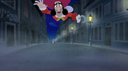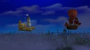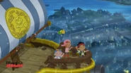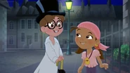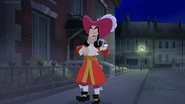 When they arrive, the Darling children mistake them for being with Hook, but once Jake explains they're allied with Peter Pan, they set off on Bucky to find the Jolly Roger, which has become lost in the fog surrounding London. During the search, Michael begins to show signs of forgetting about Peter Pan and Never Land. When they find Hook, the team is forced to split up from Bucky to confront Hook on the Jolly Roger. In the scuffle, Hook escapes to the streets below, and while Jake, Wendy, Izzy, and John pursue him, Cubby, Skully, Michael, and Nana stay on the Jolly Roger to deal with Mr. Smee, Sharky, and Bones. During the pursuit, John begins to show signs of forgetting about Never Land as well. When the balloon keeping the ship airborne is ruptured, the ship splashes down next to a dock, grabbing the attention of a late-night patrolling police officer who chases after Smee, Sharky, and Bones. By the time Jake, Wendy, and the others catch up to Hook, he's able to convince the officer that Wendy, Jake, and the kids are the bad guys, allowing him and his crew to escape back to the Jolly Roger as the fog clears so they can return to Never Land. Jake, Wendy, and the rest of the gang try to convince the officer of the truth, but it's not until he sees Tinker Bell himself does he realize he's been tricked and lets the kids go to pursue Hook back to Never Land.